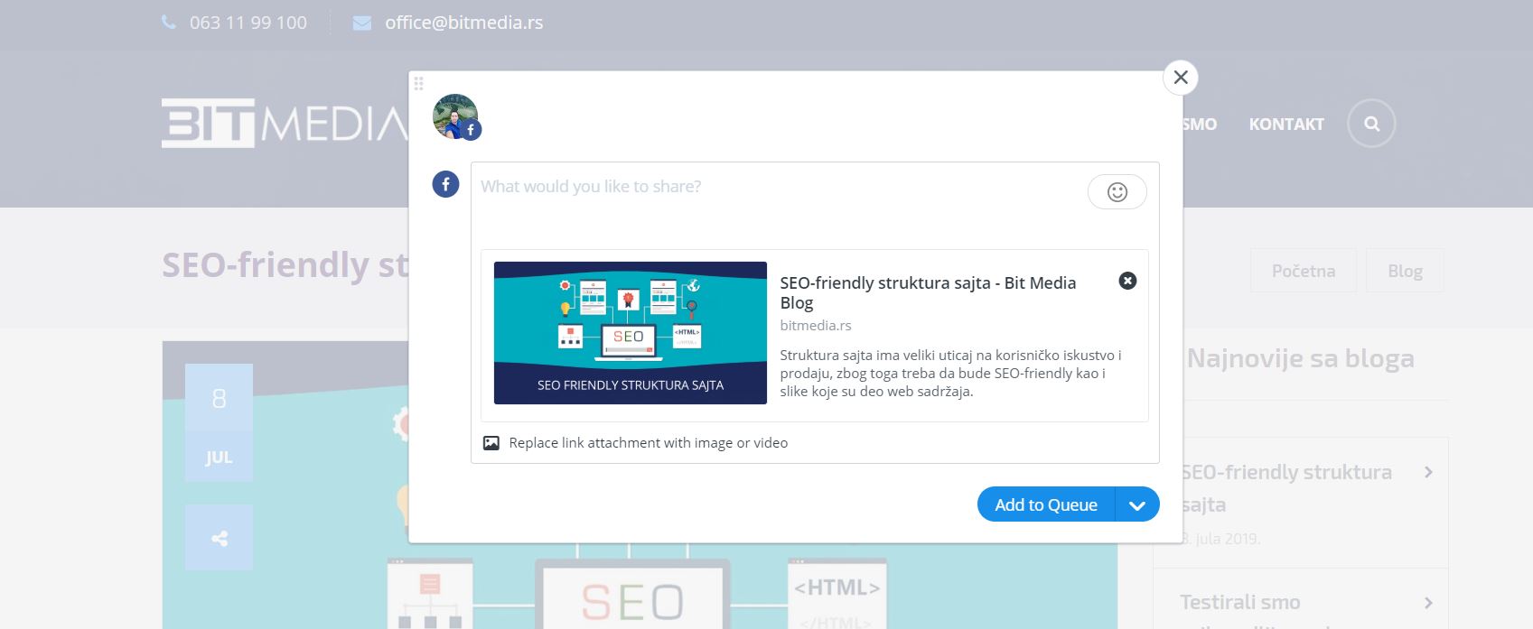 Ukoliko koristite WordPress, potrebno je da instalirate Yoast SEO plugin ili Open Graph for Facebook, Google+ and Twitter Card Tags i podesite kako će izgledati šerovanje.