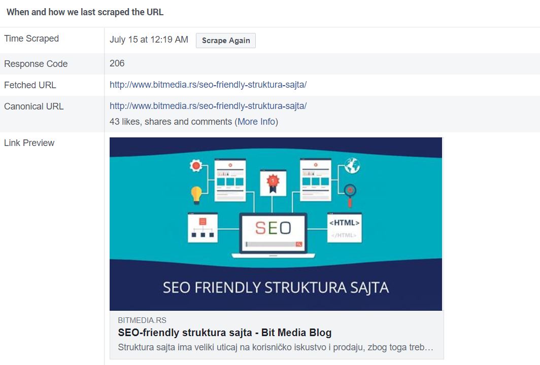 Često se događa da prilikom izrade sajta developeri ne podese „Open graph“ meta podatke i link koji se šeruje na Facebooku izgleda nepregledno, bez slike ili adekvatnog opisa i slično.