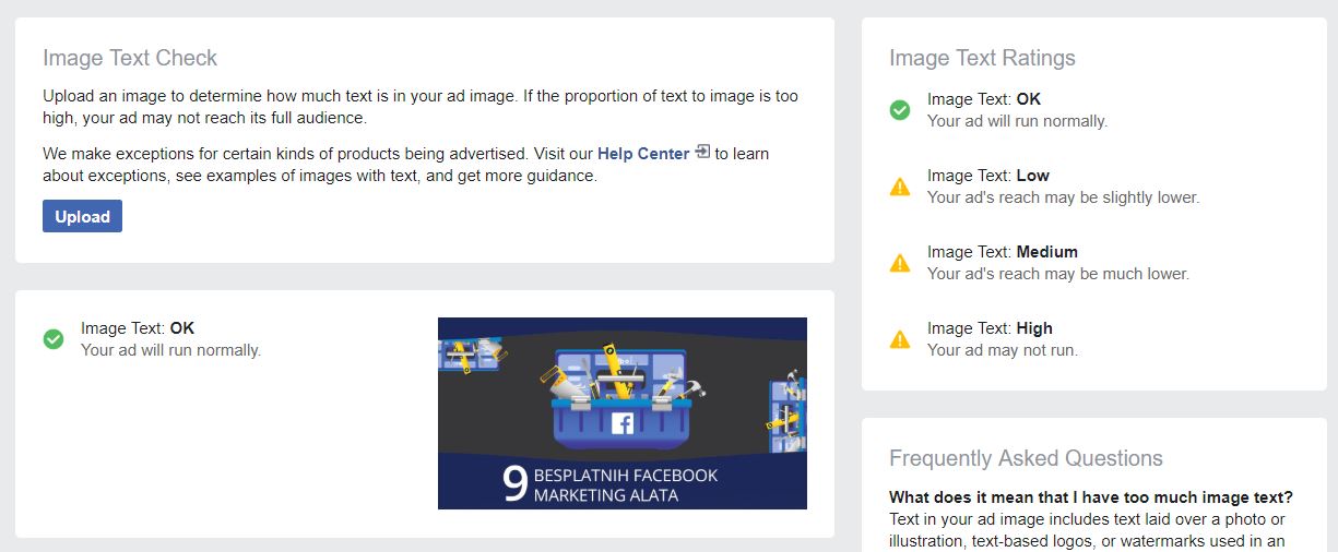 Da vam se pomenuteo ne bi dogodilo koristite Facebook-ov alat „Text overlay“. Potrebno je samo da uploadujte sliku koju želite da promovišete i Facebook će vam odmah reći kakav će biti njen rejting, odnosno da li će se prikazati ili neće.