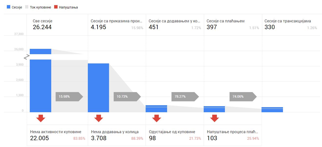 Takođe, imamo napuštanja pre dodavanja proizvoda u korpu i napuštanja nakon dodavanja proizvoda u korpu, ali i napuštanja na stranici plaćanja.